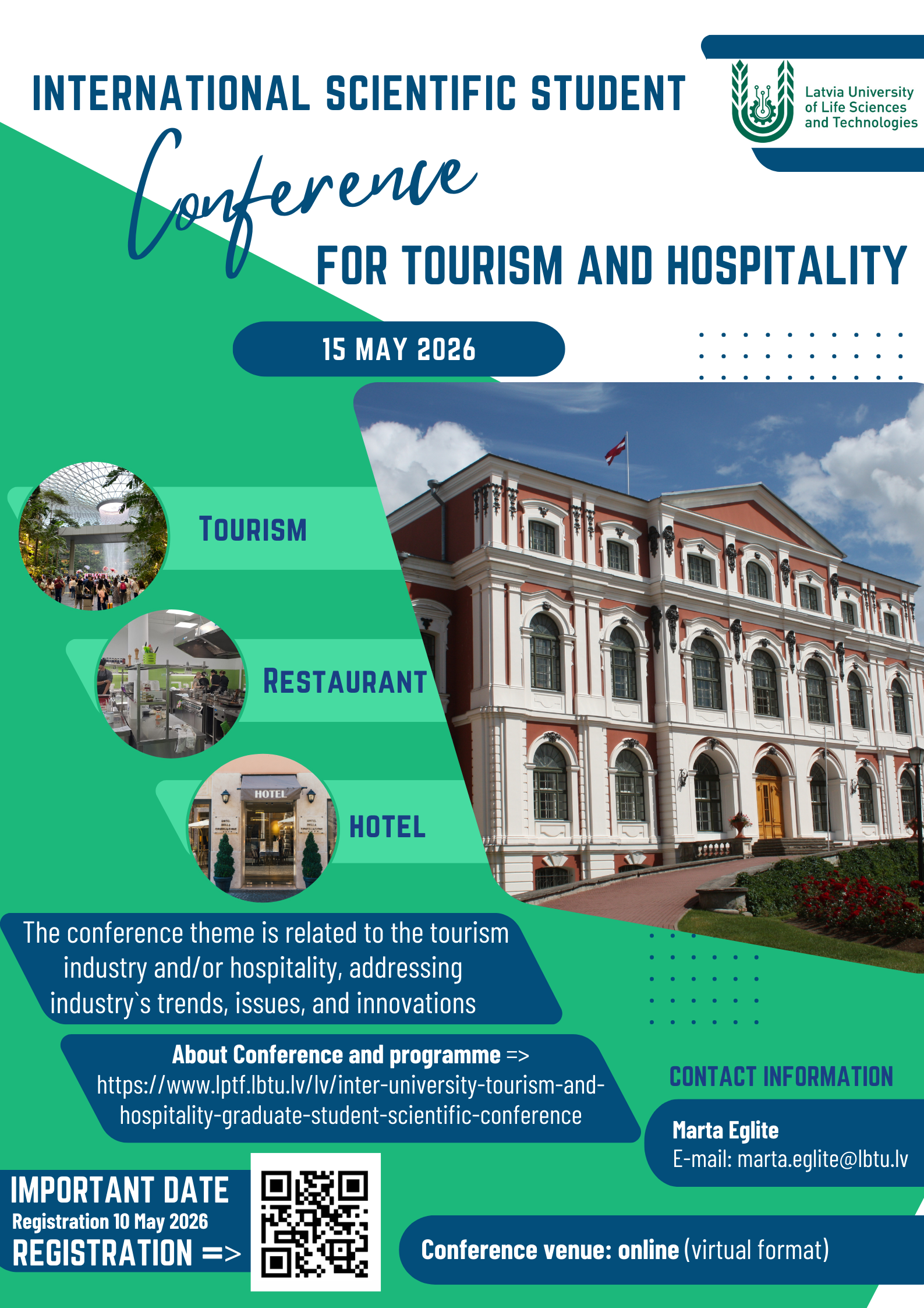 INTERNATIONAL SCIENTIFIC STUDENT CONFERENCE FOR TOURISM AND HOSPITALITY Begins 15.05.2026 10:00 Ends 15.05.2026 17:00 Place Online Detailed information is available via this link.